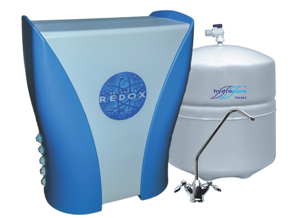 7. stopniowe urządzenie osmotyczne z membraną o wydajności 100 GPD. Zawiera 2 wkłady mechaniczne do filtracji wstępnej oraz 2 wkłady z węglem aktywowanym: wstępny (przed membrana) i końcowy. Dodatkowym elementem jest rezonator bioceramiczny do strukturyzacji oczyszczonej wody oraz Wkład REDOX służący obniżeniu jej potencjału ORP do wartości ujemnych (od -50 do -400 mV) oraz podwyższeniu pH. Urządzenie wyposażone jest w podwójny kranik umożliwiający pobór wody bezpośrednio po procesie filtracji lub mineralizowanej o zwiększonej alkaliczności i ujemnym ORP.